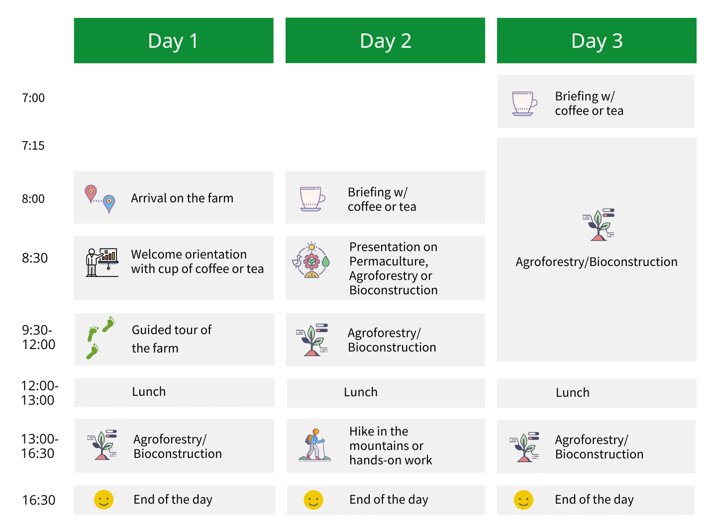 We live in a very safe region in the mountain region around Friburgo. Now at the farm we have animals like cows, chicken and dogs. We also will be walking on trails through our agroforestry systems or will be doing some activities on our building sites. So we recommend people to wear trousers (we do not recommend shorts or skirts), bring some gloves and a hat for the sun. In case of rain it is good to bring a raincoat. For some of the activities a reasonably good physical condition is required. Of course, we can adjust the program for people with physical limitations. Please inform us in advance if you have any limitations so we can make adjustments.