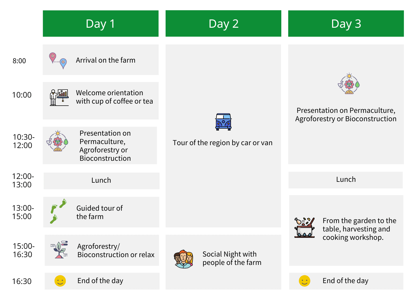 The Basic Package is for those that do not want a personalized program but just enjoy spending a few days on the farm. You can participate in one of the presentations that are ofered, enjoy the healthy warm lunch with ingredients from our garden and do some hands-on work in agroforestry and bioconstruction. Upon arrival, you will be greeted at the gate by one of our staff member who will drive you up to your accommodation. After a short welcome, you will be served a cup of coffee or tea and given an explanation of the possible activities. If you like you can join a tour of the farm, where you can see different bioconstructions and agroforestry projects. At noon, you will be served a warm meal made with organic ingredients from the farm, with several plates to choose from. After lunch, you can enjoy the views at your accommodation or join the agroforestry or bioconstruction work on the farm, which is a great opportunity to gain hands-on experience. There will always be someone around to orient you. At the end of the day you can walk back to your accommodation. You can see a possible schedule for the entire program for the 2/3 days below. Remember that you can choose which acitivities you like to join or skip.