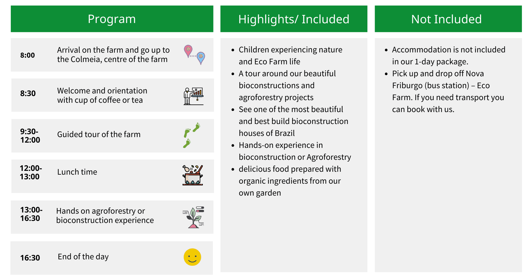 We live in a very safe region in the mountain region around Friburgo. Now at the farm we have animals like cows, chicken and dogs. We also will be walking on trails through our agroforestry systems or will be doing some activities on our building sites. So we recommend people to wear trousers (we do not recommend shorts or skirt), bring some gloves and a hat for the sun. In case of rain it is good to bring a raincoat. For some of the activities a reasonably good physical condition is required. Of course, we can adjust the program for people with physical limitations. Please inform us in advance if you have any limitations so we can make adjustments.