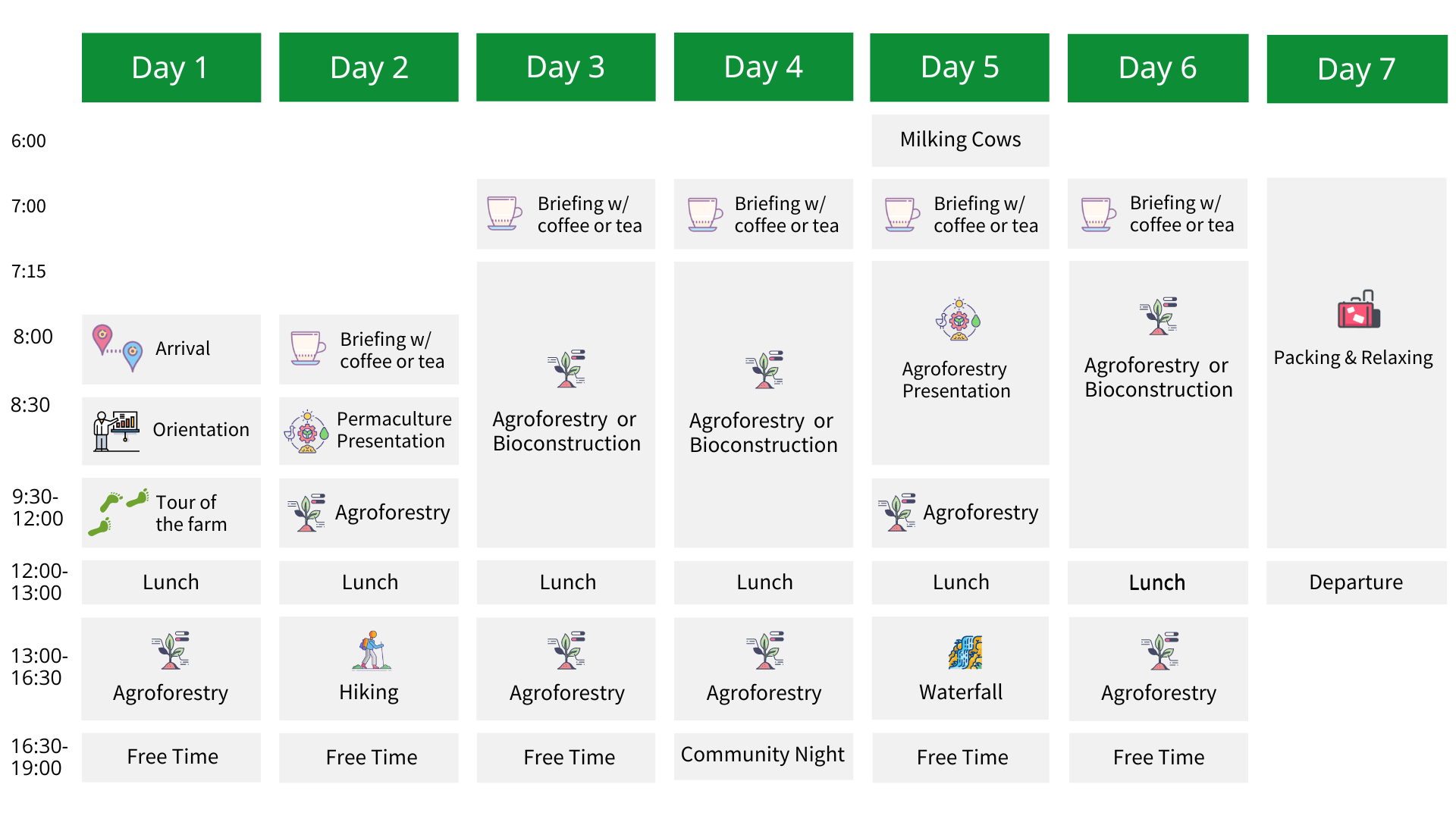 *We work normal under all weather conditions. The program is more or less what you can expect, there might be adjustments to the program depending on the day of arrival.