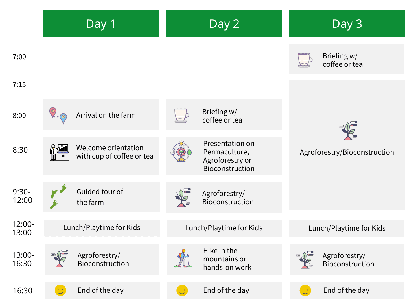 [/swmsc_text_block][gap size=”30px” id=”” class=”” style=””][swmsc_tabs tabs_style=”tabs_horizontal” content_style=”content_with_border” tabs_align=”left” id=”” class=”” style=””][swmsc_tab title=”Basic Package” icon_name=”hand-grab-o”]Our Basic Package is for families that want to join the day to day activities of the farm. On arrival someone will welcome you at the gate. Sometimes we will have a car available to drive you up hill to the centre of the farm but this depends on availability (ask for this when you book in case this is important for you). In case not you will start your experience with 1,5 km hike up hill. We will keep your bags safely down at the entrance and drive them up as soon as possible. A Highlight of the experience is the option to rent our Eco Lodge. A beautiful and very comfortable bioconstruction house in beautiful nature with incredible views over the farm. Once you have settled in there will be short welcome, a cup of coffee or tea and a explanation of the activities. Then you will be shown arround the farm. You will see different bioconstructions and agroforestry projects. At noon it will be lunch time where you will be able to serve your own plate with organic ingredients of our farm. After lunch you can join the agroforestry or bioconstruction work on the farm. This is the oportunity to have hands-on experience. There will be someone arround to orientate you. At the end of the day you will go to your accommodation and enjoy living in a bioconstruction house and the incredible views over the farm. This program is for families that want their children to join a ussual day at the farm. For a more personalized program and special activities for the children we recommend our personalized package or our premium package. Here you can see a schedule for the entire program for the 2/3 days: